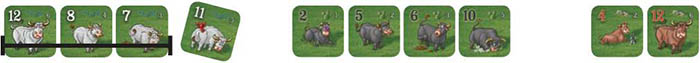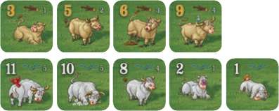 Each player draw 3 Cattle Tiles (5 in a 2-player game, 4 in a 3-player game) from the draw pile and look at them. You may keep up to 3 of the drawn tiles. If you keep three, they all must be of value 4 or lower. If you keep two, they both must be of value 8 or lower. Only if you keep just one, it may be of any value. Remove the tiles you did not choose from the game.