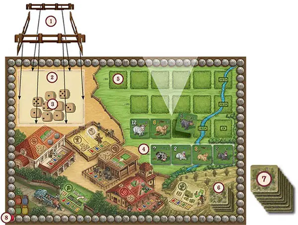 Place 4 face-down Cattle Tiles in a pile on the Steppe space 6. Place the leftover Cattle Tiles in a face-down draw pile 7 next to the game board.