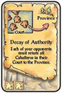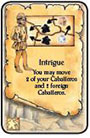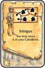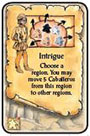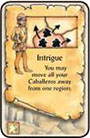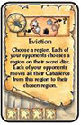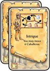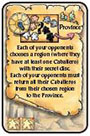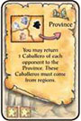 In clockwise order, each of your opponents must return 3 of their Caballeros to the Province. These Caballeros may come from their Court and/or a region on the board.