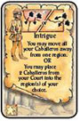 With this card, you may place up to 3 Caballeros from your Court into regions or the Castillo: 1 into a region neighboring the King's region, and 2 into the region(s) of your choice (including regions neighboring the King's).