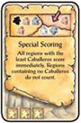 During your turn, the region containing the least Caballeros is scored. If there are several regions tied for the least Caballeros, each of these regions is scored. The Castillo and regions containing no Caballeros may not be considered.