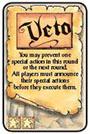 When you choose the Veto card, place it faceup in front of you. Once during this round or the next round, you may entirely or partly prevent another player from executing his special action. You may prevent a special action before or during its execution. The player affected by the Veto must immediately terminate the execution of their special action.