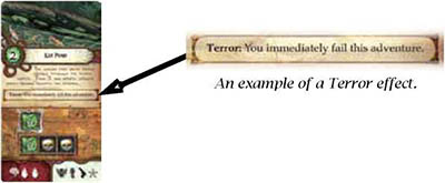 When a player fails to complete a task and at least one of the rolled dice produced a terror result, he resolves all Terror effects on the Adventure card as well as any on the Mythos card currently in play.