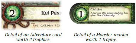 When a player successfully resolves Adventure cards or completes the tasks on Monster markers, he typically receives these cards or markers and may later spend them as trophies (for example when executing the buy a souvenir ability on the Entrance reference sheet). The amount of trophies an Adventure card or Monster marker is worth is printed on the individual card or marker.