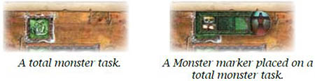 A total monster task is one that has all of its requirements surrounded by the white border. When a Monster marker is placed on a total monster task, it replaces the task completely on the Adventure card and is treated as another task that must be completed in order to resolve the Adventure card.
