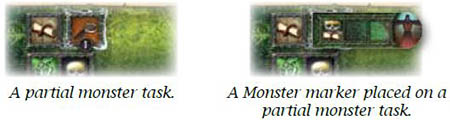 If there are multiple monster tasks in play, the active player decides which one to place the Monster marker on. If there are no monster tasks in play not already covered by a Monster marker, the active player chooses any 1 Adventure card and places the Monster marker under the bottom task of the card, adding an additional task to the Adventure card.