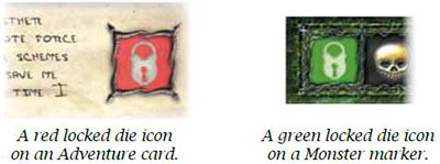 Some Adventure cards, Mythos cards, and Monster markers feature a locked die icon. When one of these icons appears, the active player must immediately place 1 die of the corresponding color on top of that icon.
