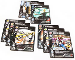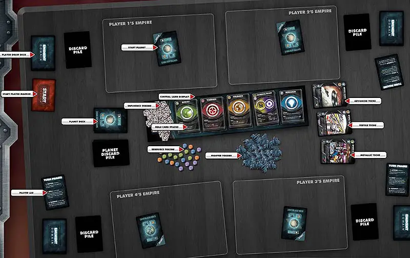 Eminent Domain is an empire building game in which your empire's abilities are based on a deck of Role cards. At the beginning of the game each player has the same deck of cards.