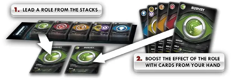Every turn you must choose a role to execute and in doing so you will add one of those Role cards to your deck. When executing a role, you may Boost its effect by playing cards out of your hand matching the role you have chosen.