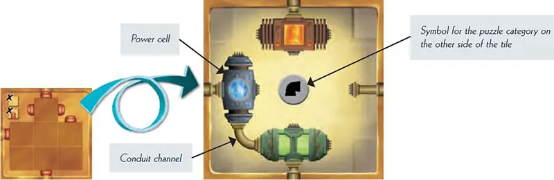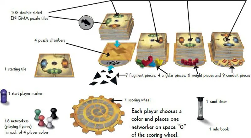All players simultaneously solve different puzzles. If you succeed before the sand timer runs out, you may flip over your puzzle tile and connect it to the ENIGMA conduit system.