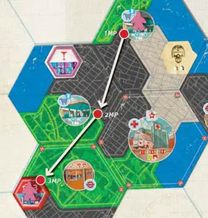 Example: It is Vinnie's turn. He uses 1 MP to leave the store where he ended the previous turn and moves to the industrial area (black). He continues moving through interconnected industrial spaces (costing 0 MP), until he uses his 2nd MP to change to a residential Land type. He then finally moves into the Safe House, spending his 3rd and last MP.