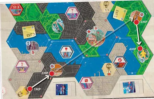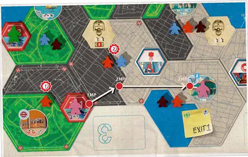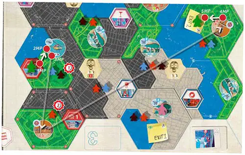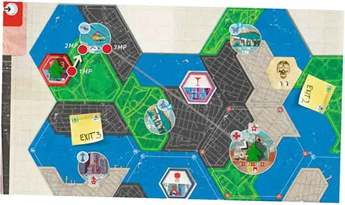 Example: Scar spends 2MP to move to the Heliport Location, and then spends her remaining MP to fly to the Subway. Using the Subway gives her 1 extra MP this turn, and she also uses a Gas can token to get another 1 MP. This allows her to move to the Exit.