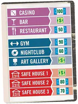 Example: If this is your Escape Plan card, you receive money if you visit Safe House 1, the Bar, and the Art Gallery. All other places are worth money only at the end of the game.