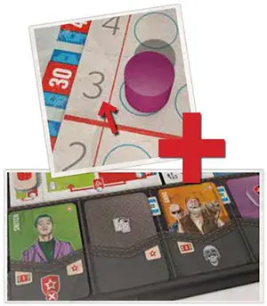 Example: It is Scar's turn. She uses her Informer card as an Executive Action which allows her to lose 1 Notoriety. She moves one of her Notoriety cubes to her blue box. She then visits the Gallery, where Mr. Bones and Ruby are already.
