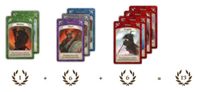 Example: Roderick has managed to play 3 Bands of Allies during the last Age. He scores 1 Glory for the Band with 2 green cards, 6 Glory for the Band with 3 Dwarves, and 6 Glory for the Band of 4 red cards: a total of 13 Glory.