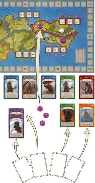 Example 1: Roderick is ready to make his move. He plays all 3 of his Dwarf cards, making sure that the purple one is on top-that's the Leader of his new Band. Since the Leader of the Band is purple, Roderick can place a Control marker in Duris if the Band is big enough. Since he currently has 2 Control markers there, a Band of 3 Allies is big enough for him to place his third marker. Now he's in control of Duris! But will he keep it? Roderick then discards all of the cards still in his hand, placing them with the other face-up cards next to the board.
