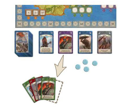 Example: Roderick has his eye on the Kingdom of Duris, so he needs at least one purple Ally. He already has a couple of Dwarves in his hand, so he takes the face up purple Dwarf card. Soon, Duris will be his!