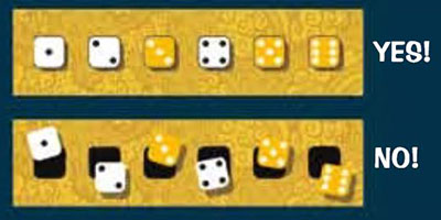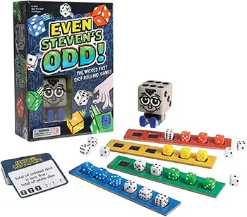 Each player chooses a set of 6 dice (3 of the same color and 3 white) and a color-coordinated dice holder. Place Steven and the stack of cards face down in the middle of the playing surface.