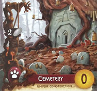 When you place a worker here, reveal 4 cards from the draw pile or discard pile and play 1 of them for free. Discard the others. Your worker must stay here permanently. Cemetery may only have up to 2 workers on it, but the second spot must be unlocked by having a Undertaker in your city.