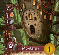 When you place a worker here, give 2 of any resources to an opponent and then gain 4 points. Worker stays here permanently. Monastery can only have up to 2 workers on it, but the second spot must be unlocked by having a Monk in your city.