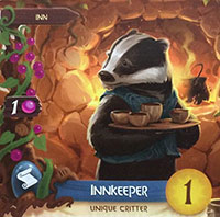 When you play a Critter, you may discard this Innkeeper from your city to decrease the cost of the played Critter by 3 berries. You do not gain the 3 berries. This card cannot be combined with any other card-playing abilities-including the Inn, any forest tiles that allow you to play a card, or cards like the Dungeon.