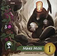 When played and during Production, you may copy any 1 green Production card in any opponent's city. Basically the Miner Mole becomes that card for a moment-so if copying a General Store, you would receive 2 berries if that opponent also had a Farm in their city. Solo Game: You may copy any green Production card in Rugwort's city with the Miner Mole.