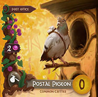 When played, reveal 2 cards from the deck. You may immediately play 1 of these worth up to 3 points, for free. Discard the other. Solo Game: If you play a Postal Pigeon and activate its ability to play another card, that counts as you playing 2 cards, so on Rugwort's turn he will play 2 cards.