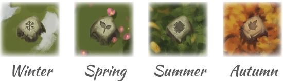 You will be exploring these areas during these seasons of the game: Winter: Foothills; Spring: Peaks; Summer: Ridge; Autumn: Expedition. While in each season, you must follow the rule restrictions of the corresponding Weather card.