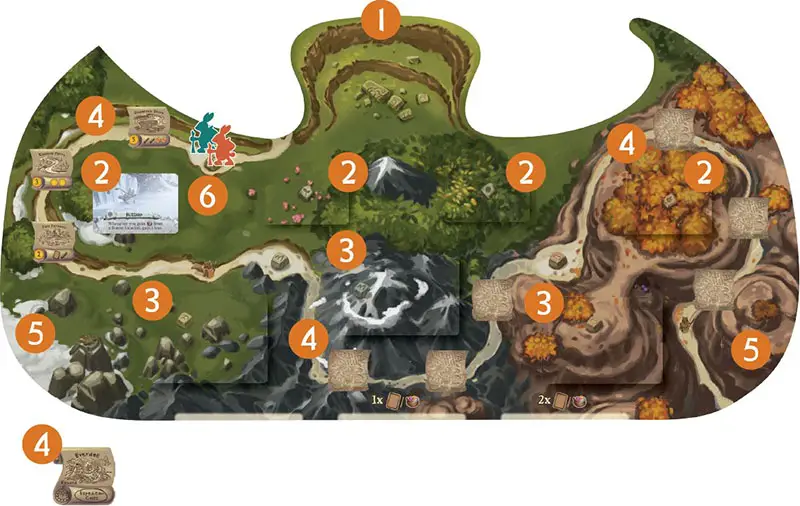 4 Give each player an Everdell map tile. Then shuffle the 24 map tiles and place 1 more than the amount of players faceup on the Foothills portion of the trail. Then place the same amounts facedown on the Peaks trail and Ridge trail. Return the remaining map tiles to the box, unseen.