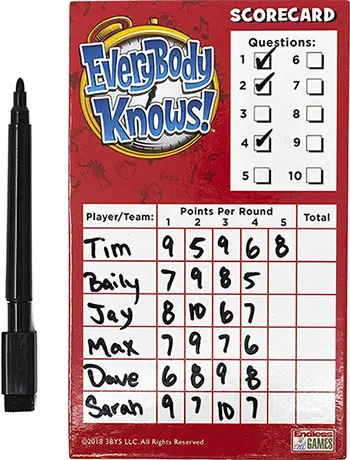 The Oldest player goes first (Or Team containing the oldest player). Any other player may be the question-reader/score-keeper. Keep the scorecard and marker within reach of the reader.