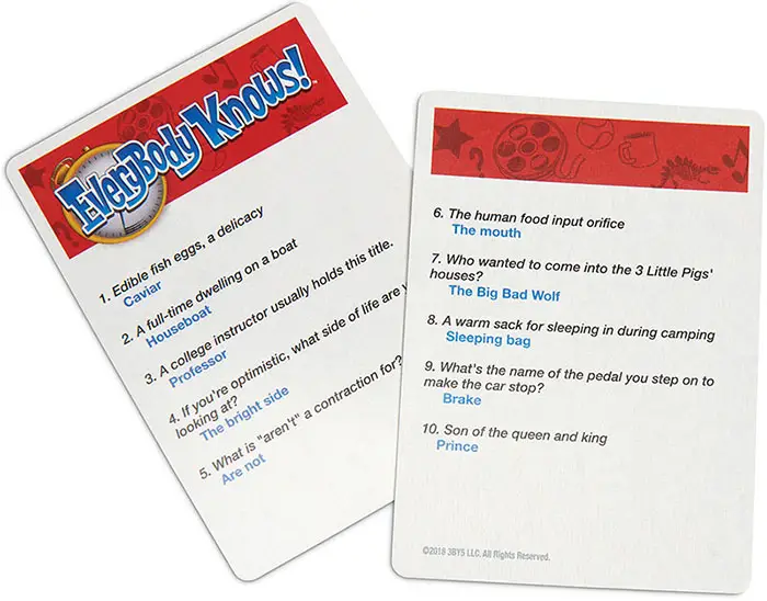 However, you must answer all 10 questions correctly before time runs out. Go 10 for 10 in 60-seconds and you win that card. Earn 3 cards first to win the game! (For team play, earn 5 cards first to win)