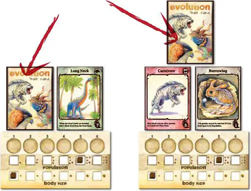 He takes a new Species Board and puts Wooden Markers at Body Size "1" and Population "1". The new species must be placed to the left or the right of his existing species; they may not be placed between existing species.