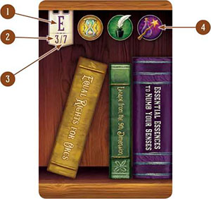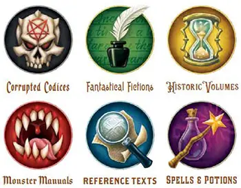 Example: At the end of a game, Ruth has 5 Fantastical Fictions books, 9 Historic Volumes books, 7 Monster Manuals books, 6 Reference Texts books, and 6 Spells & Potions books. She earns 3 points for each of her Fantastical Fictions books (15 points total), since it is the category she has the least of. Corrupted Codices were the Banned Books category and weren't considered.
