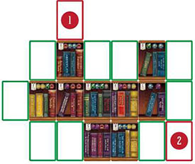 You will earn a bonus at the end of the game for the largest rectangular group of cards in your bookshelf that includes cards on your bottom row. Every card in that rectangular group will earn you I point. A rectangle must be at least two cards tall and two cards wide to Qualify.