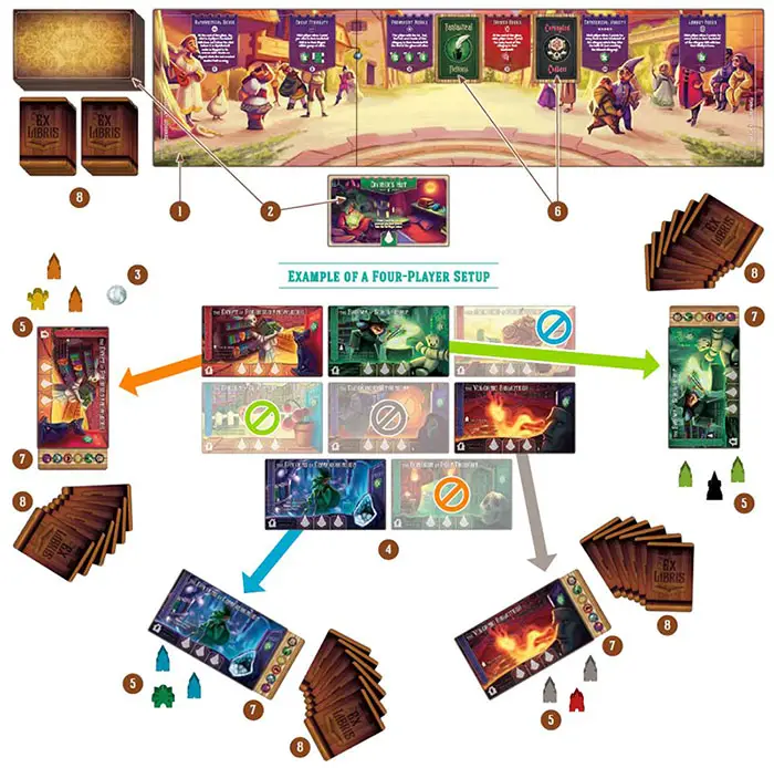 Note: For a beginner game, give each player a single library tile. The basic libraries are printed on the back. (See page 19 for more details on the beginner game).