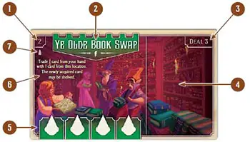 Next, check to see if any of the face-up locations have preparation instructions in their upper right corner - these will tell you a specific number of cards to deal onto the card area on the right side of the tile. Follow these instructions, and if more than one card is dealt onto the tile, splay them vertically so that the vital information of each card can be seen.