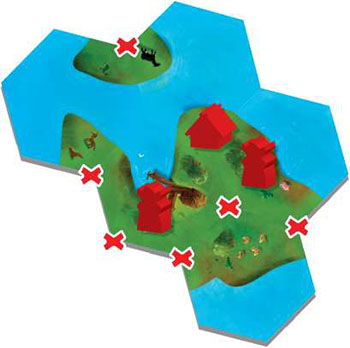 Example: Red has 2 Vikings surrounding the point where 3 Tiles join by land. They spend 2 actions to construct an Outpost.