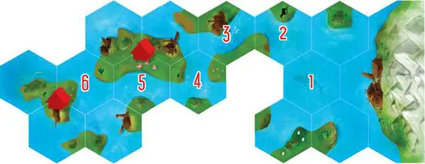 The most effective way to control Islands is by constructing Outposts. Scoring Islands will be explained later. As 2 actions, players may construct an Outpost on a point where 3 Tiles are joined by land.