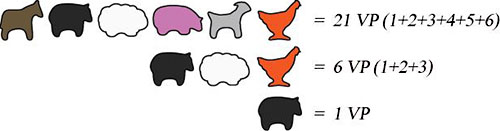 Players score increasing amounts of Victory Points for delivering sets of unique Livestock types. 1 Livestock of any type is worth 1 VP. A set containing 1 of each type is worth 21 VP (1+2+3+4+5+6).