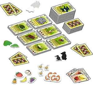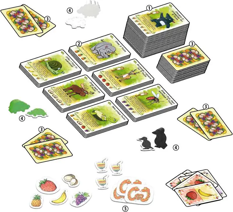 The loser of the previous game is the new start player and chooses one of the unused animal tokens as the new start player token. Shuffle all fruits and again deal 2 fruits to each player. Check the available locations, and ensure you have all required additional game components which may be identified on these cards. You are now ready to play again!