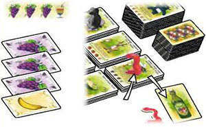 To pay the price, you discard the required fruits from your hand, and take a location card from its small stack. Place it face down in front of you, so it shows the bottle filled with the fabled juice.
