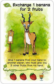 Location #2: Exchange 1 banana for 2 fruits Give 1 banana from your hand to another player, who must give you 2 other fruits from his hand.