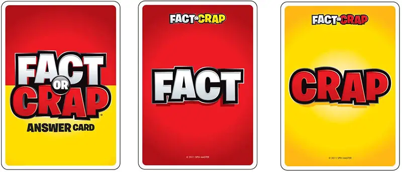 After the Reader has read the first question, the other players have to decide as fast as they can whether the answer is Fact or Crap. The players indicate their answer by putting face down either their Fact Answer card or Crap Answer card.