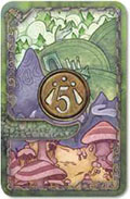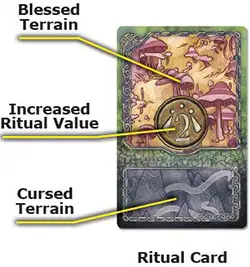 The top of the card shows blessed terrain, which increases the number of points scored for the ritual by the value shown on the card. The bottom of the card shows cursed terrain, which is one way that a ritual can be disrupted.