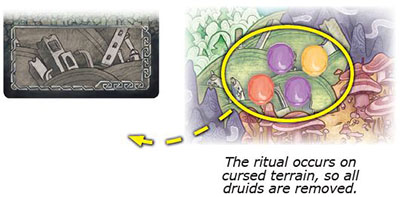 If a ritual occurs on cursed terrain, return all of the druids on that space to the box. No colors score any points for this ritual.