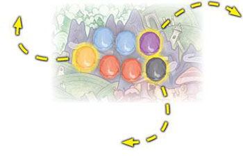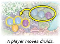 The game is played over a series of turns starting with the oldest player at the table and proceeding clockwise. During your turn, you choose a space containing one or more druids and move all of those druids into an adjacent space also containing one or more druids.