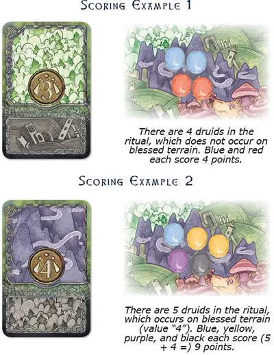 After resolving disruption (and removing druids), players check the ritual's final value. Each remaining druid (regardless of color) in the ritual space is worth one point. If the ritual occurs on blessed terrain, the ritual is worth additional points as shown on the card.