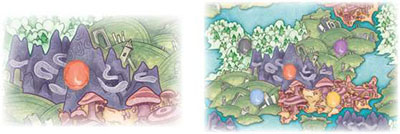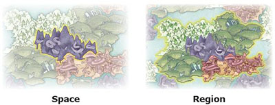 The game board is divided into 60 spaces and 12 regions. A space consists of a single terrain type (shown by its illustration and color). A group of five spaces forms a region, which is separated from other regions by water (a combination of rivers and lakes).