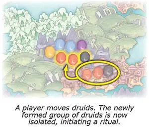 After you move druids, if a space containing one or more druids becomes isolated (all of its adjacent spaces contain no other druids), a ritual occurs.