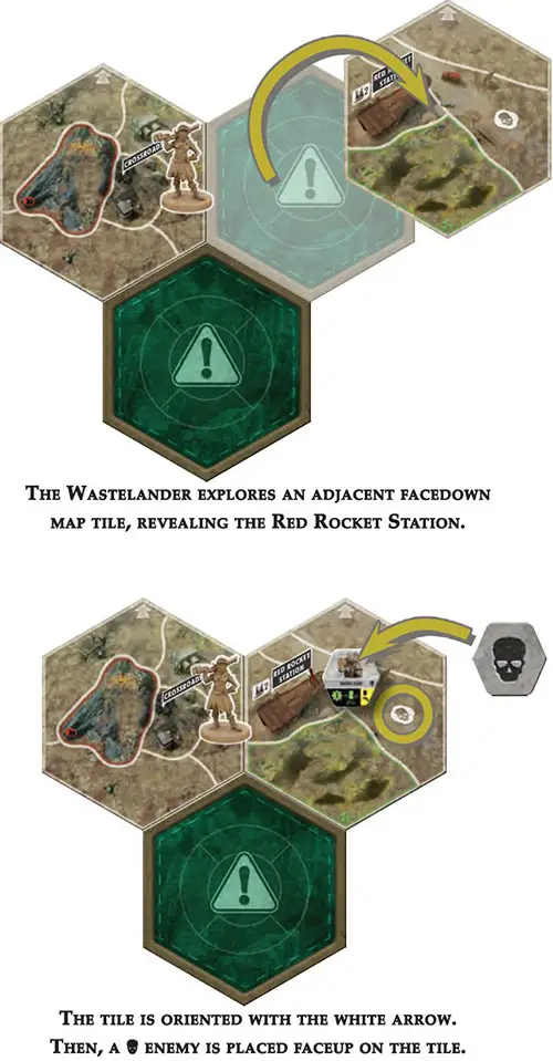 No one is exactly sure what is waiting out there in the wasteland, but you're going to find out! There's a lot of unexplored territories out there represented by facedown map tiles, and you can use the explore action to find out what mysteries they hold.